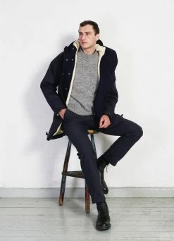 The fabric is a combination of a Herringbone weave and Pinstripes. It is made of 100% cotton with a pin striped pattern. It is classic and has strong traditions within men’s clothing with references to power and wealth. Pin stripes origins from uniforms worn by those who worked in banks, for the purpose of easily being recognized and not mistaken for being robbers or other intruders. In this case the colour gives the classic pinstripe a new more relaxed twist.