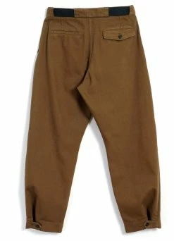 KARLO is a wide cut pleated trouser with a heavy black cotton ribbon belt. It has pleats at the knees and a button width regulator at the bottom leg. The front pockets are slanted and the back pockets are welted.