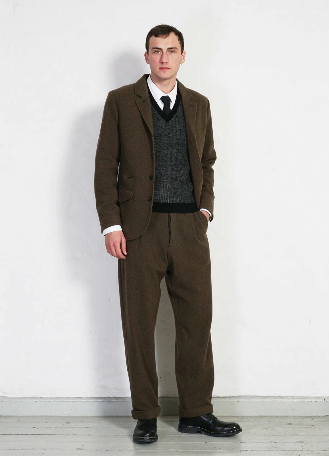 SUNE is a loosely fitted trouser with single pleats, folded cuffs and wide straight cut legs.