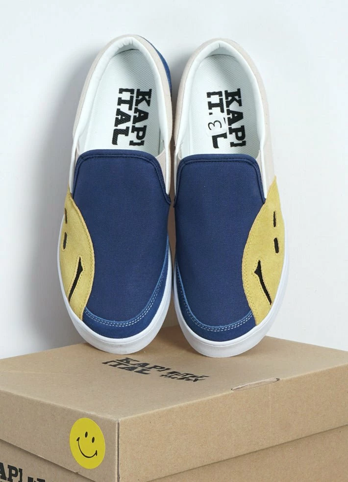 Simple slip-on shoe in a premium thick cotton canvas with suede mudguard, heel and Kapital Rain Smile detail. Leather lined.