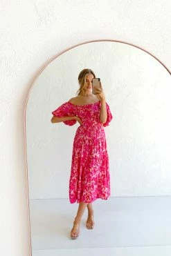 - off the shoulder fuchsia floral print dress