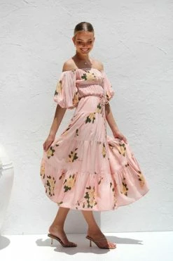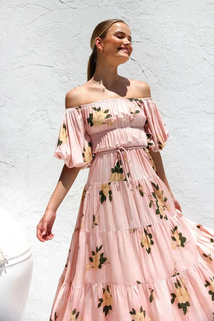 - off the shoulder pink floral print dress